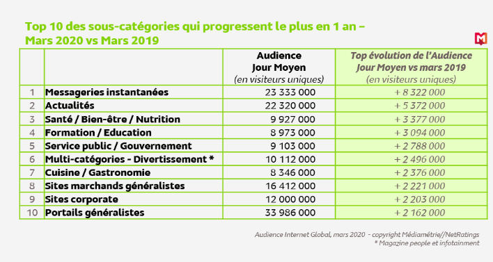 Durant la période de confinement, 62% des Français déclarent avoir augmenté leur temps passé devant leur écran mobile. Selon Médiamétrie les internautes se sont connectés plus fréquemment au cours du mois : chaque jour, environ 45,8 millions d’individus ce sont connectés sur internet. Ces connexions représentent 700 000 personnes de plus qu’en mars 2019 soit 73.1% de la population Française.